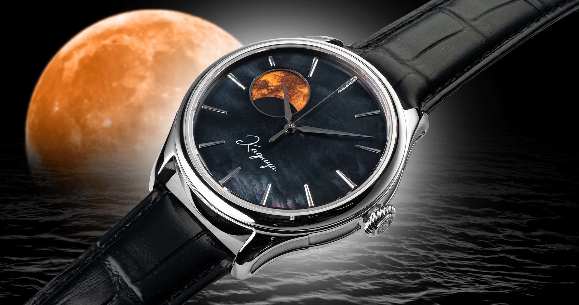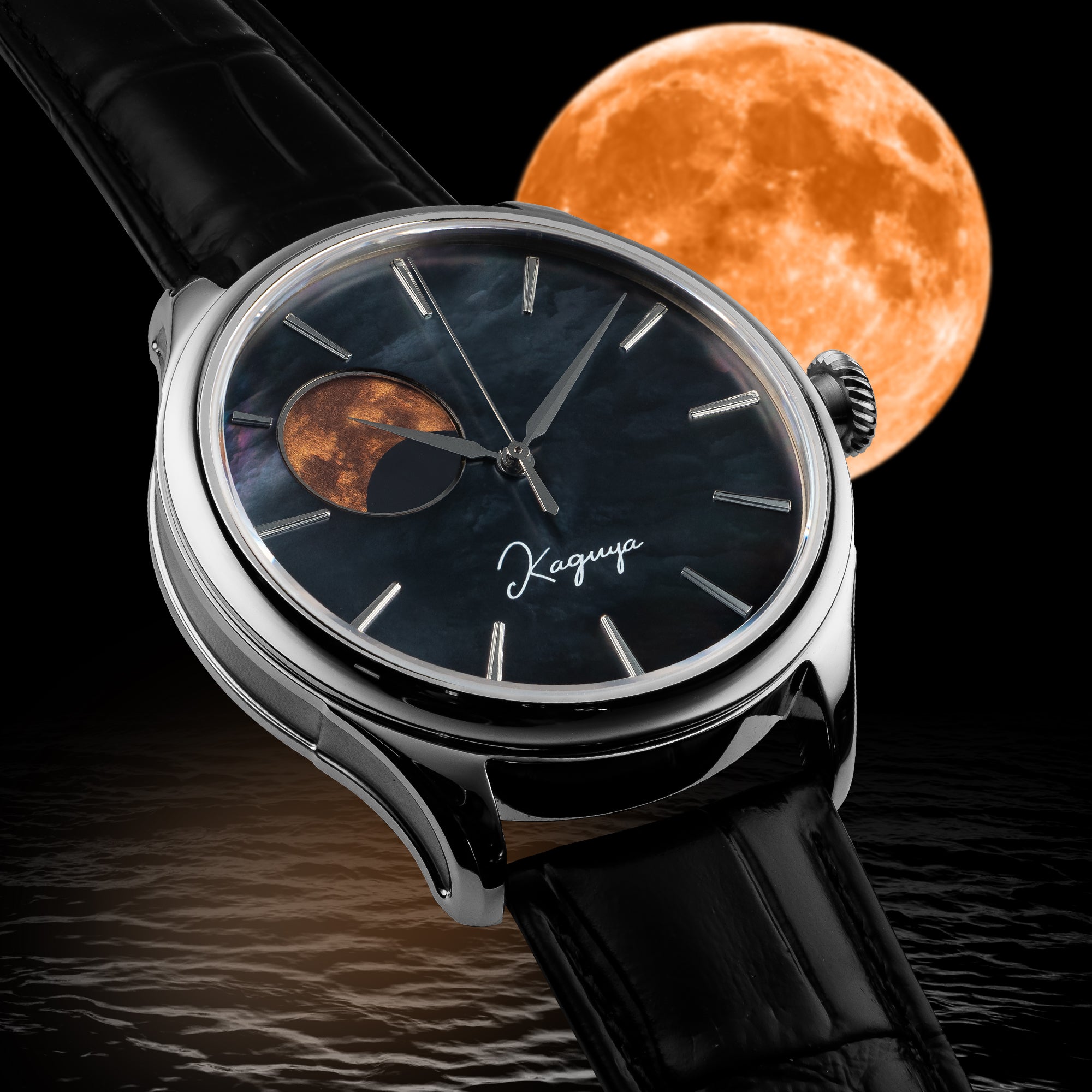 ドリーム・ムーンフェイズ -KAGUYA- のユニークさは何と言っても文字盤です。黒で染め上げた文字盤は、マザーオブパールのがもつ煌めきで白や青といった様々な表情を覗かせます。