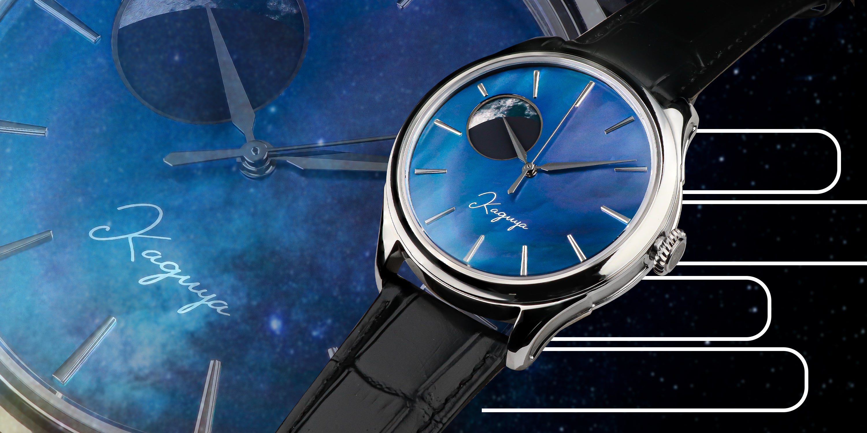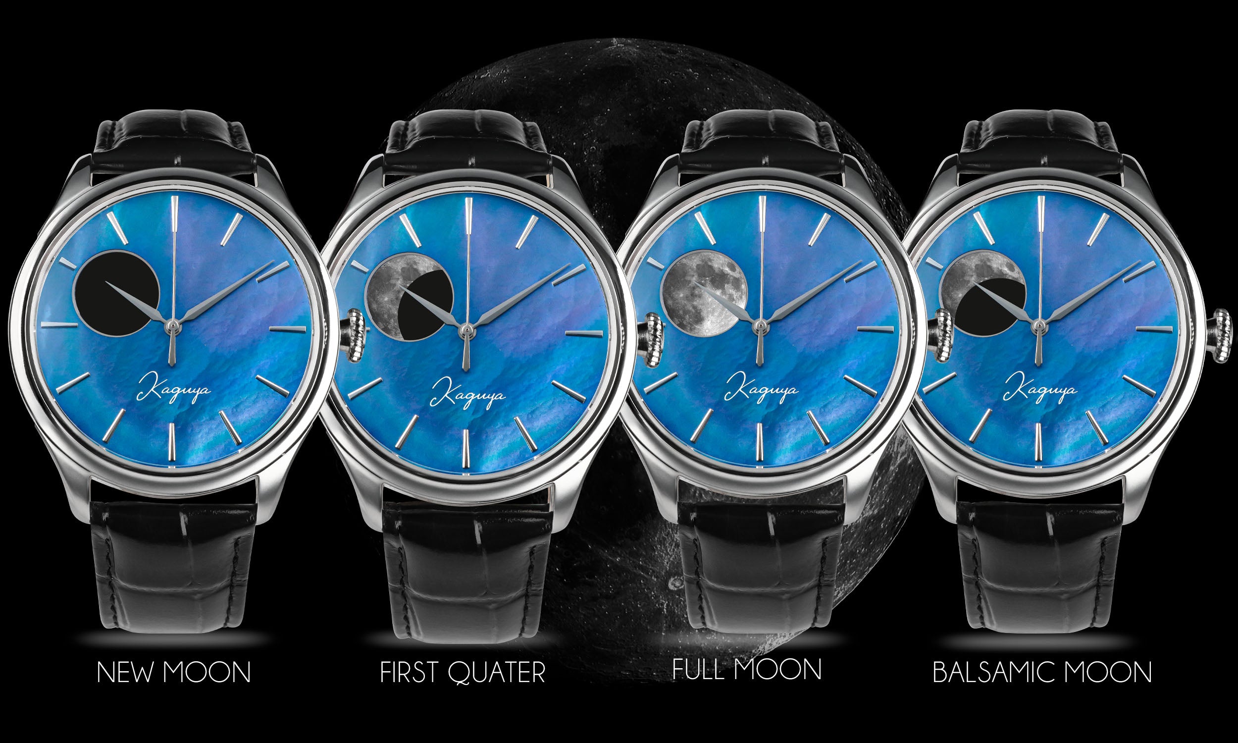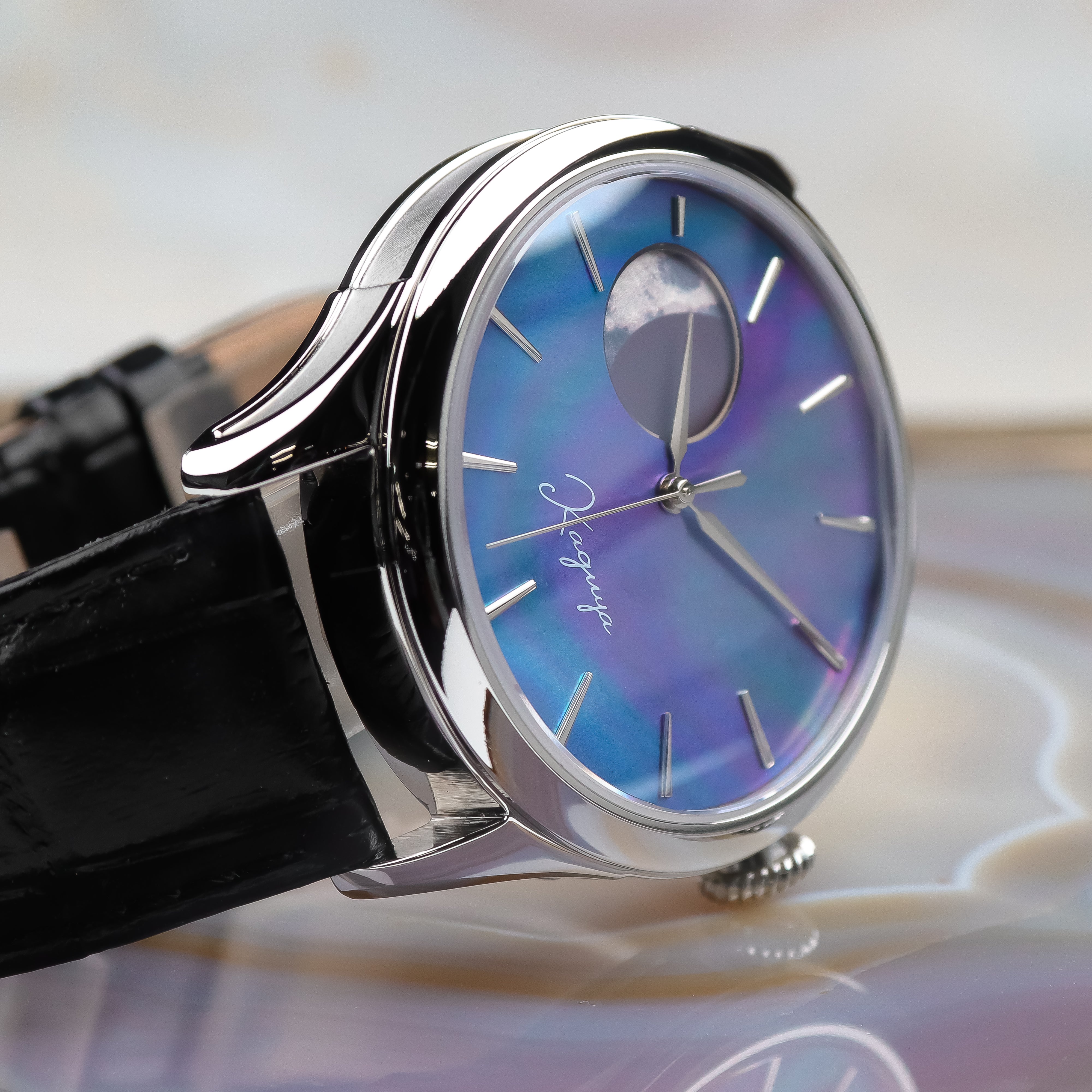 KAGUYAコレクションでは、10時の位置に月の満ち欠けが分かる月窓を備えています。実際の月の写真を転写することで、よりリアルに31日周期で月が変化していく様を見ることができます。このコレクションは『竹取物語』の主人公かぐや姫へのオマージュであるとともに、時計を楽しむための遊び心を添えています。
