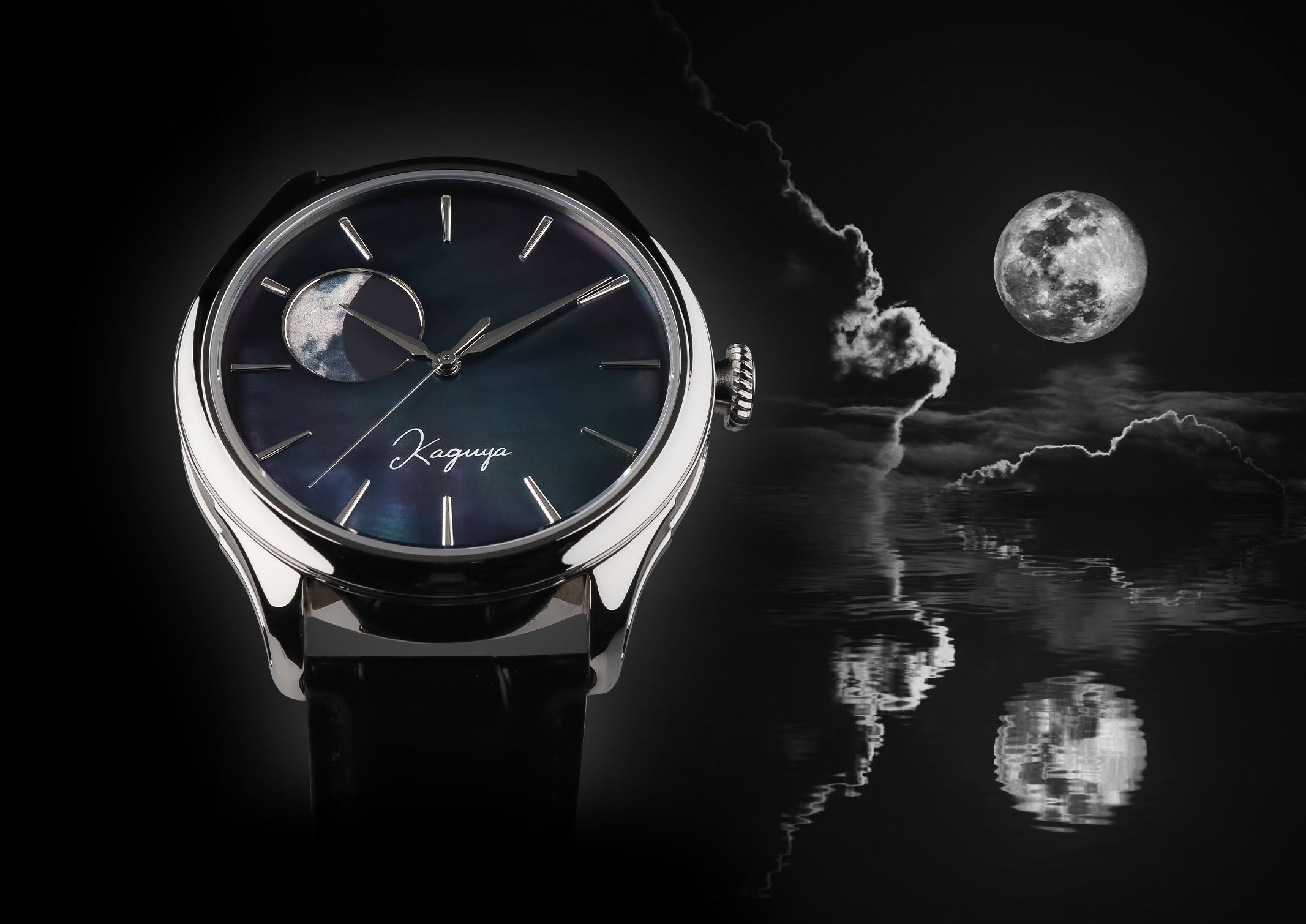 KAGUYAコレクションでは、10時の位置に月の満ち欠けが分かる月窓を備えています。実際の月の写真を転写することで、よりリアルに31日周期で月が変化していく様を見ることができます。このコレクションは『竹取物語』の主人公かぐや姫へのオマージュであるとともに、時計を楽しむための遊び心を添えています。